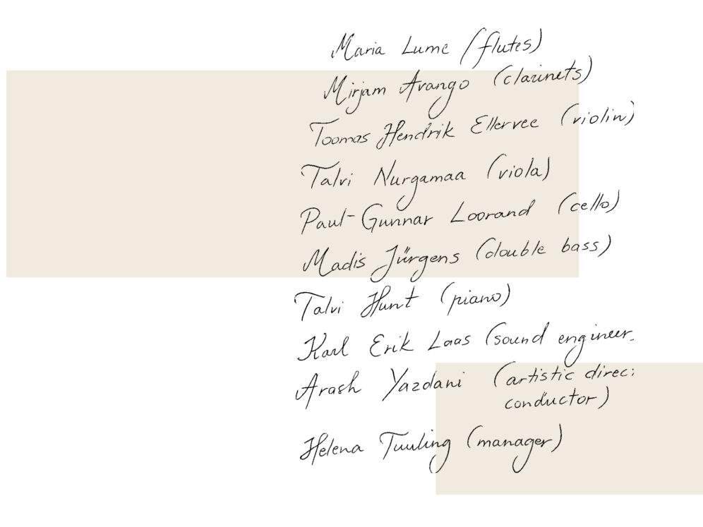 “I am deeply grateful to Ensemble for New Music Tallinn for giving me a rare and enriching opportunity to experience music within a truly unique sound world. There is a special joy in those moments when rehearsals grow intense and we all work together toward a shared goal. Even when the text and concept of a piece are set before rehearsals begin, the final result can still bring a refreshing surprise. It is this sense of discovery that makes contemporary music endlessly fascinating for me.”