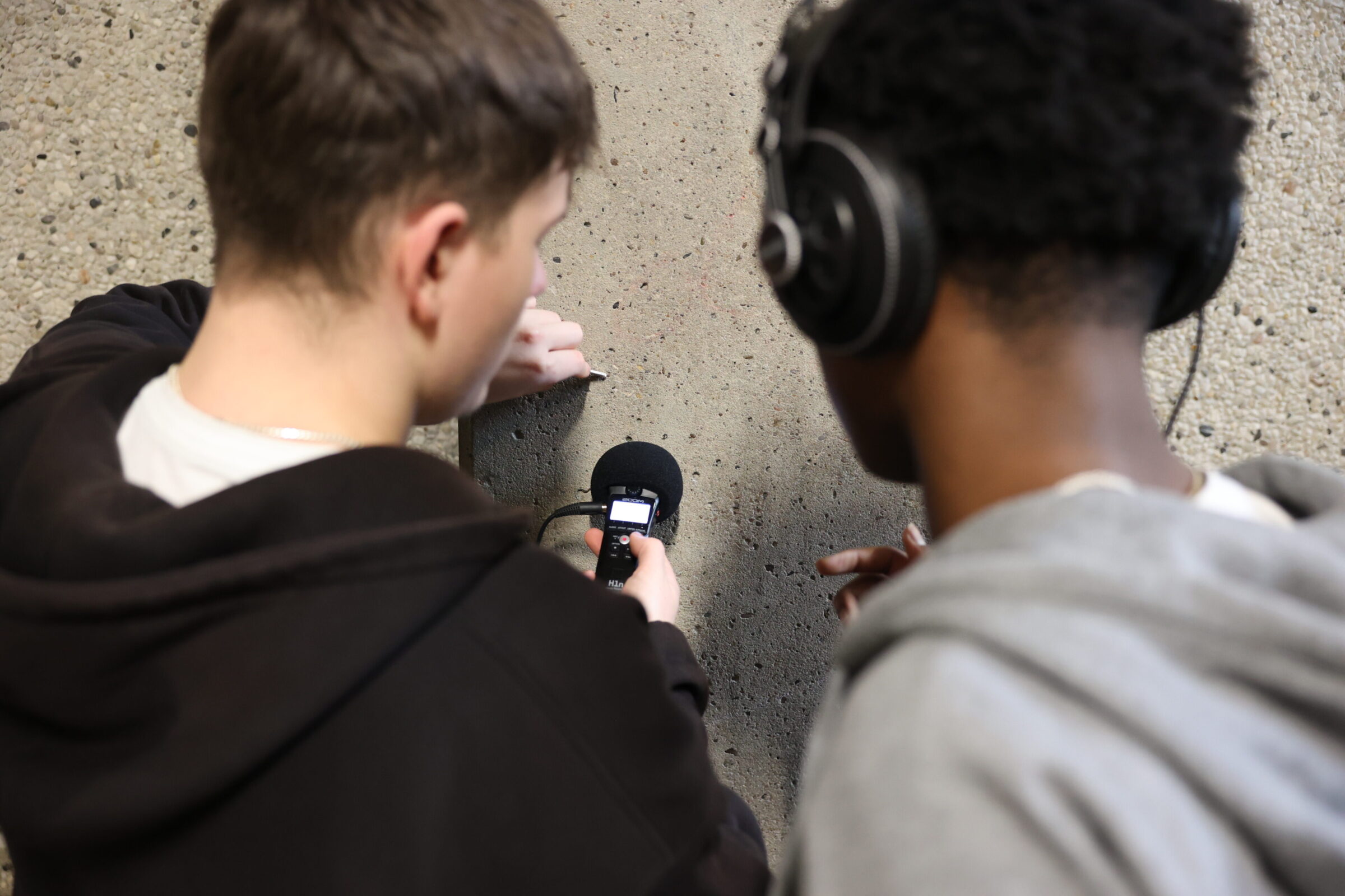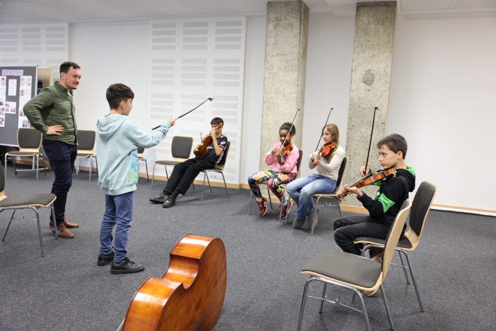 In the first half of the year, the focus is on getting to know one another, exchange, and sonic discoveries. The young people experiment with instruments and participate in sound workshops—sometimes with instruments, sometimes without. Under the guidance of Sabine Kuhnert, the educational and artistic director of the Zukunftslabor program, their musical ideas are collected and compiled so that composers who align with the young people’s ideas can be found.